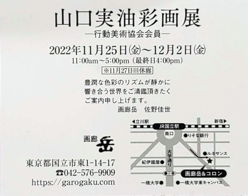 山口実 油彩画展 のご案内:2022年11月25日~12月2日 (国立)画廊 岳にて